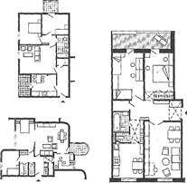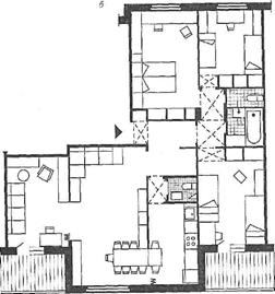 Рис. 2 - Примеры планировочных решений двухкомнатных квартир Трехкомнатные квартиры предназначены для заселения семей из трех-четырех человек. Комнаты могут быть изолированные или одна из них смежная. Санитарный узел - раздельный. Одну из комнат используют как гостиную, другую (изолированную) как спальню, третью как детскую (рис. 3). Для больших семей из четырех-шести человек предусматривают четырехкомнатные и пятикомнатные квартиры (рис. 4). Возможно расположение комнат в подобных квартирах в двух уровнях на двух верхних этажах секционных домов. Общая комната располагается смежно с передней и в удобной связи с кухней. Такую связь осуществляют через раздвижную перегородку или специальное передаточное окно в шкафу-буфете, являющемся перегородкой между комнатой и кухней. Многокомнатные квартиры ориентируются на две противоположные стороны здания (квартиры со сквозным проветриванием).