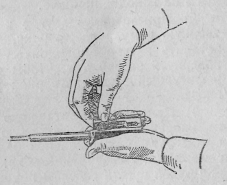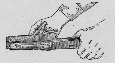 Продолжая удерживать автомат левой рукой, правой рукой отвести затворную раму назад до отказа, приподнять ее вместе с затвором (рис.5) и отделить от ствольной коробки. 7) Отделить затвор от затворной рамы. Взять затворную раму в левую руку затвором кверху (рис. 6); правой рукой отвести затвор назад, повернуть его так, чтобы ведущий выступ затвора вышел из фигурного выреза затворной рамы, и вывести затвор вперед. 8) Отделить газовую трубку со ствольной накладкой. Удерживая автомат левой рукой, правой рукой надеть пенал принадлежности прямоугольным отверстием на выступ замыкателя газовой трубки, повернуть замыкатель от себя до вертикального положения (рис. 7) и снять газовую трубку с патрубка газовой камеры.