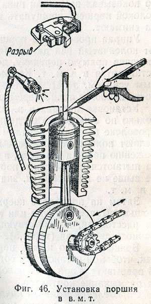 | Если зажигание установлено с большим отклонением от норм, имеющихся в табл. 5, то двигатель пустить не удается и работать он не будет. При неточно установленном зажигании двигатель может работать, но пуск его затруднен, развиваемая им мощность, а также срок его службы уменьшаются. При чрезмерно ранней установке зажигания наблюдаются встречные удары педали при пуске и металлические стуки в двигателе даже при незначительном возрастании нагрузки. От позднего зажигания быстро, докрасна нагревается выпускная труба, слышны выстрелы в глушителе, число оборотов коленчатого вала двигателя увеличивается медленно, и двигатель не развивает полной мощности. Для проверки точности установки момента зажигания требуется выполнить следующие операции: подвести поршень в в.м.т. в конце такта сжатия и затем сместить поршень на величину, рекомендованную заводом, вращая вал в сторону, противоположную его вращению при работе двигателя; установить прерыватель в положение начала размыкания контактов и проконтролировать совпадение момента начала размыкания с положением поршня. Для определения такта сжатия четырехтактного двигателя прокручивают коленчатый вал пусковой педалью или оукой за колесо при включенной передаче у стоящего на подставке мотоцикла и следят за клапанами: если впускной клапан поднялся и опустился, то, значит, поршень перемещается к в.м.т., совершая такт сжатия. При дальнейшем движении поршня между толкателями и впускными и выпускными клапанами должны образоваться нормальные зазоры, подтверждающие, что поршень находится вблизи в.м.т., соответствующей концу такта сжатия. Если зазоры не образуются, то поршень ошибочно подведен в в. м. т., соответствующую концу выпуска. Эту ошибку допускают весьма часто. Коленчатый вал двигателя в этом случае прокручивают вторично. Определение такта сжатия в двухтактном двигателе упрощается, так как в нем всякая в. м. т. является концом такта сжатия. Установку поршня в в.м.т. производят следующим способом (фиг. 46).
