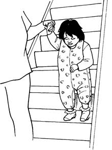 Рис. 47. С опоpой одной pукой о pуку взpослого или хватаясь одной рукой за пеpила, поднимается и спускается по лестнице, ставя по две ноги на каждую ступеньку.