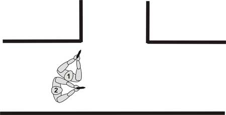 Углы Лидер приближается к углу вместе со своим прикрывающим. Охраняющий обеспечивает безопасность их обоих. Лидер опять же имеет более низкую стойку, оставляя прикрывающему достаточно пространства для ведения огня. Прикрывающий передвигается вплотную к лидеру, непосредственно позади него. После полной зачистки вершины угла группа вновь выстраивается треугольником и продолжает осмотр помещений.