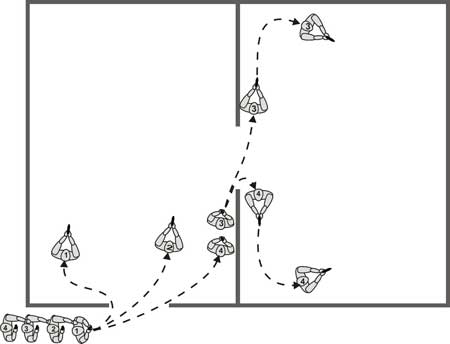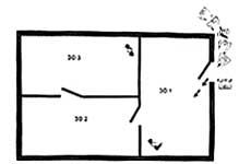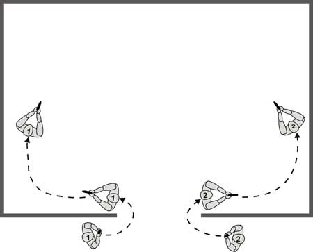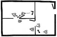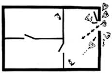 Вариант входа четырёх человек в две комнаты Если при штурме необходимо захватить помещение со смежными комнатами, то возможно применение следующей тактики. Штурмовая группа занимает исходную позицию перед дверью, ведущей в первую из смежных комнат. После команды “Штурм” группа захвата, а именно №1 и №2, врывается через дверь и поражает находящихся поблизости преступников. Последние ворвавшиеся в комнату члены группы захвата №3 и №4, забрасывают светозвуковыми гранатами смежную комнату, и немедленно после взрыва группа захвата врывается в комнату с преступниками.