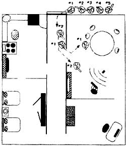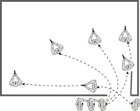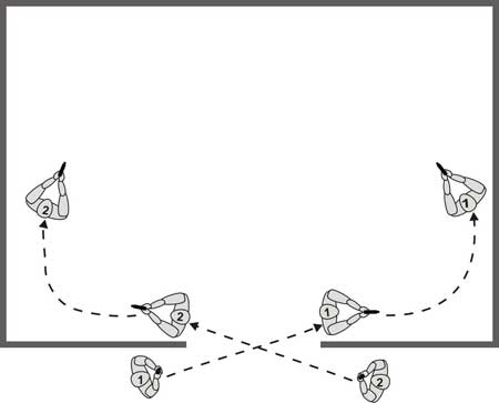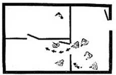 Данная тактика применяется при любом штурме, когда главная задача состоит в нейтрализации преступников за счет внезапности, стремительности и огневой мощи. В целом, наиболее предпочтительна при динамичном штурме тактика «массированной атаки», когда для приобретения контроля над объектом в него врывается как можно больше штурмующих. Но четыре человека это, как считается, оптимальный вариант, поскольку большее количество штурмующих в одной комнате может создать помехи сами себе. Ещё раз обратим внимание на то, что при стремительном проникновении четырех бойцов в помещение важно правильно организовать «сектора обстрела», о чём уже было рассказано в предыдущих статьях. Из рисунков видно, что №1 и №2 заходят в комнату, применяя рассмотренные способы проникновения для двоек, а №3 и №4 выходят в центр, в сторону №1 и №2 соответственно.