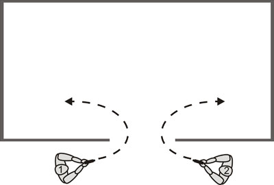 Практика показывает, что не всегда сотрудники могут войти в комнату вдвоём. Здесь очень много различных факторов: узкая лестница, двустворчатые двери, а открывается только одна половина шириной 50 см. и другие факторы. Исходя из этого, нередко, сотруднику приходится некоторое время осматривать комнату одному. Поэтому в момент входа в помещение, сотрудник, определив своё направление движения и используя естественные укрытия (стол, шкаф, угол комнаты и т.д.) может сделать круговое вращательное движение (движение - " юла").