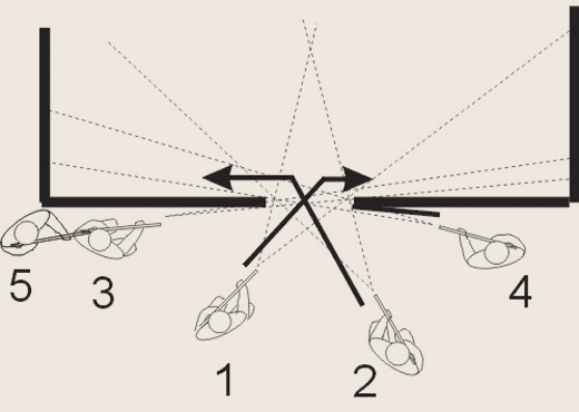 3 — просмотр своего сектора, (при отсутствии угрозы — опускает ствол), перемещается к дверному проёму, прикрывая 1 (ствол 3 над головой 1). 4 — просмотр своего сектора, вход (от дверного проёма двигается боком, контролируя свой сектор) прикрывает 2 (ствол 4 — над головой 2).