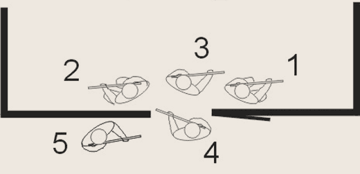 · 1 — сидит (оружие слева) · 2 — сидит (оружие справа) · 3 — сидит (оружие слева) · 4 — стоит (оружие справа, открывает дверь) · 5 — стоит (оружие справа)