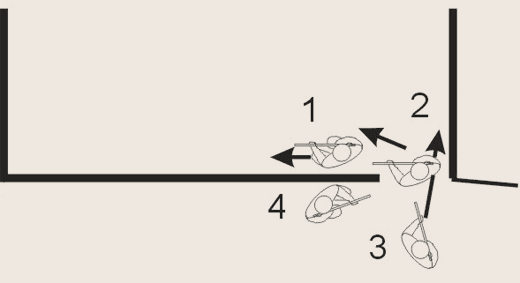 3 — просмотр своего сектора, вход (от дверного проёма двигается боком, контролируя свой сектор), прикрывает 1 и 2 (ствол 3-го над головой 1 и 2), при отсутствии угрозы — садится. 4 — вход (от дверного проёма двигается боком, контролируя свой сектор), ствол над головой 1 и 2.