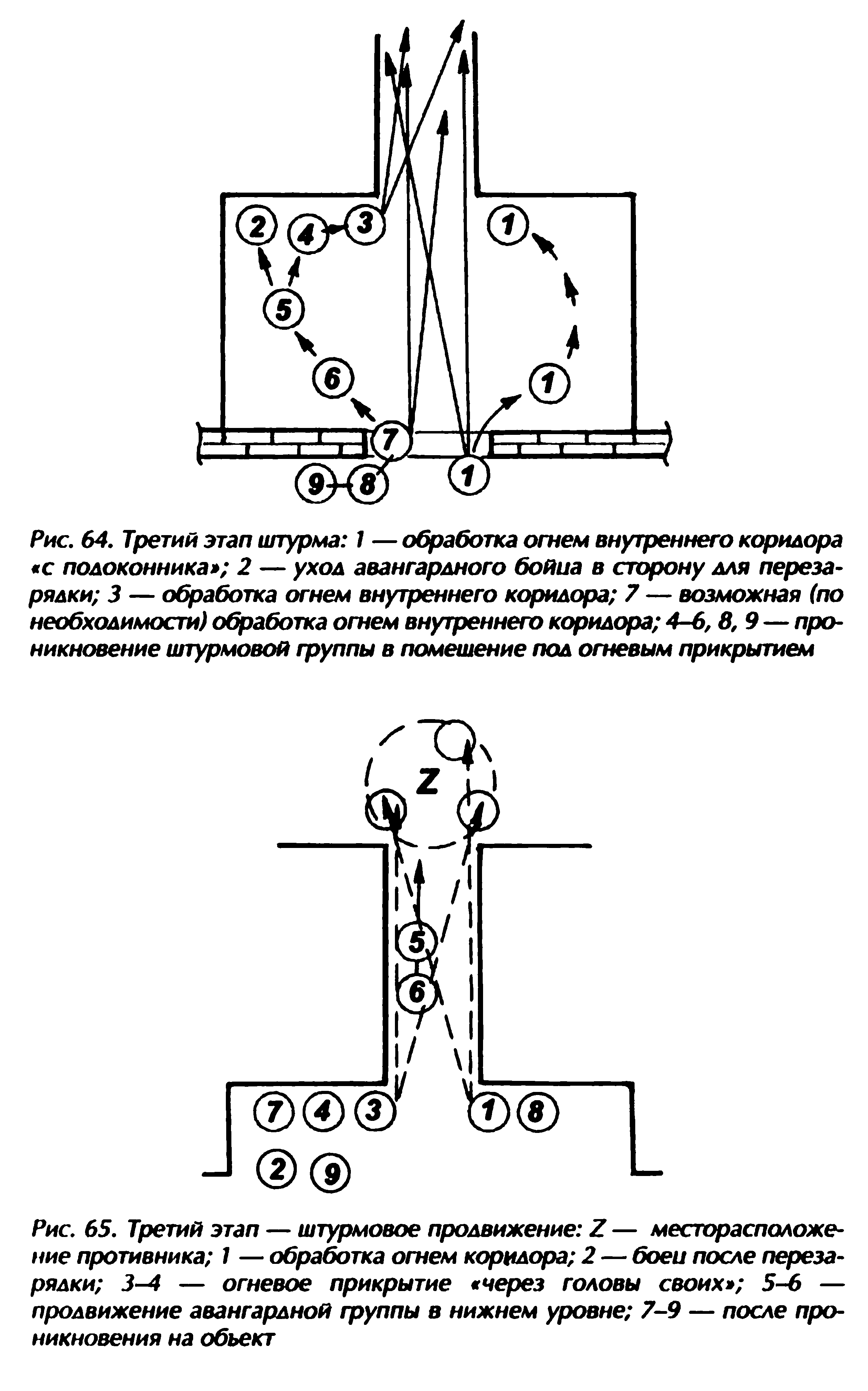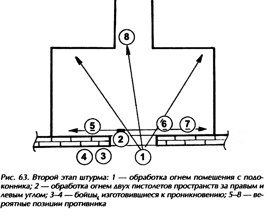 6. Вначале необходимо обучить личный состав индивидуальным действиям: правильная стойка, удержание оружия, перекладывание оружия с плеча на плечо, тактическое перезаряжение оружия, использование вспомогательного оружия, осмотр пространства (единое движение глаз и оружия). Затем — практика индивидуального перемещения: приставной шаг, скрестный шаг, ускоренное перемещение, огибание углов, использование зеркала, перемещение по лестнице. Далее — групповая тактика: движение группы по коридорам без дверей, скрытный вход, динамичный вход в простые помещения, в сложные помещения, в квартиры, подходы к дверям, проход лестниц, После этого — движение по зданию (комбинированные задачи). При этом обучение должно строиться следующим образом: вначале — подробное объяснение порядка действий каждого члена группы с разъяснением причин тех или иных действий. Потом — поэтапный вход каждого члена группы. Затем — вход с нормальной скоростью. После чего необходимо менять членов группы по очерёдности входа (чтобы каждый сотрудник прочно закрепил навыки входа и первым номером и вторым и т.д.). На этом этапе можно операцию входа комбинировать с «задержанием / ликвидацией» условного преступника (освобождением заложников). 7. Только после чёткой отработки всеми сотрудниками операции входа можно усложнять условия: мебель в квартире, ширма, дым, слезоточивый газ, светошумовые устройства, подход к зданию по улице или по пересечённой местности, неожиданная подброска гранат, отвлекающая стрельба (выработка отсутствия реакции у сотрудников) и т.д. При передвижениях с перекрытием секторов целесообразно опрашивать сотрудников во время медленного поэтапного перемещения о том, какие сектора на данный момент являются наиболее опасными и какие сектора будут представлять опасность при следующем перемещении.
