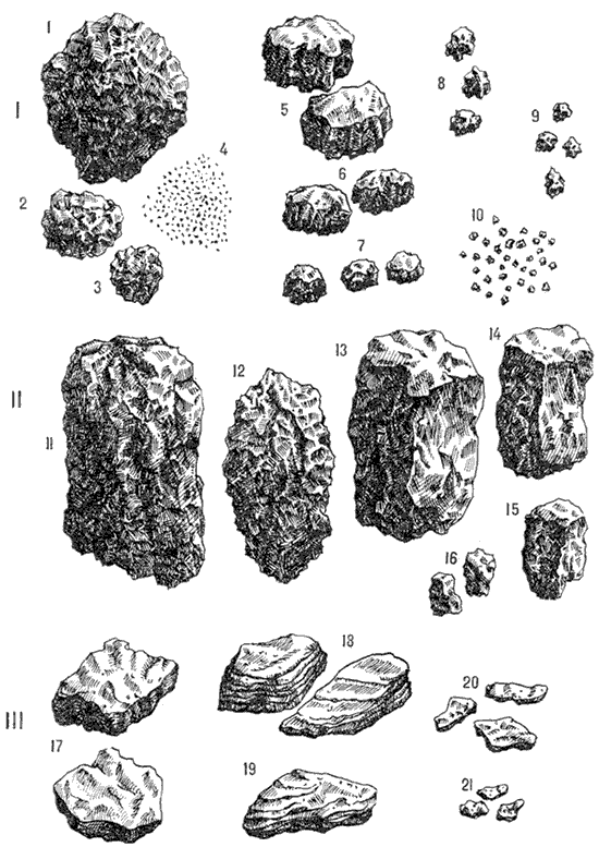 Рисунок 7 – Типичные структурные элементы почвы (по С.А. Захарову): I тип: 1) крупнокомковатая, 2) среднекомковатая, 3) мелкокомковатая, 4) пылеватая, 5) крупноореховатая, 6) ореховатая, 7) мелкоореховатая, 8) крупнозернистая, 9) зернистая, 10) порошистая. II тип: 11) столбчатая, 12) столбовидная, 13) крупнопризматическая, 14) призматическая, 15) мелкопризматическая, 16) тонкопризматическая. III тип: 17) сланцевая, 18) пластинчатая, 19) листоватая, 20) грубочешуйчатая, 21) мелкочешуйчатая Таблица 2 – Классификация структурных отдельностей почв (по С.А. Захарову)