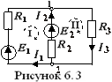 Приклад 1 Рисунок 6.1 Визначити струми у вітках схеми зображеної на рисунку 6.2, якщо Е1 = 15 В; Е2 = 14 В; R1 = 3 Ом; R2 = 2 Ом; R3 =6 Ом.