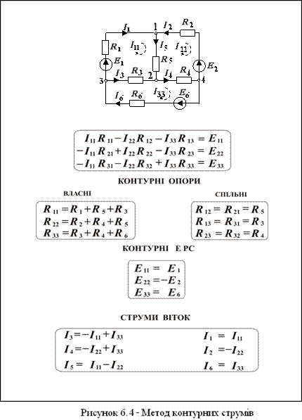 Розв’язок (рисунок 6.6): Схема має два незалежних контури I – II, а отже, і два контурні струми І11 та І22, додатні напрямки яких приймаємо довільно. 1 Розраховуємо контурні ЕРС: Е11 = Е1 – Е2 = 15–14 = 1 В, Е22 = Е2 = 14 В. 2 Власні опори контурів: R11 = R1 + R2 = 3+2 = 5 Ом; R22 = R2 + R3 = 2+6 = 8 Ом. 3 Спільний опір контурів: R12 = R21 = R2 = 2 Ом. 4 Система рівнянь матиме вигляд: