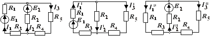 Рисунок 6.10 Рисунок 6.11 Рисунок 6.12 Розв’язок: 1 Визначаємо часткові струми І1', І2', І3' іеквівалентний опір Rе', вилучивши із схеми джерело з електрорушійною силою Е2 (рисунок 6.11):