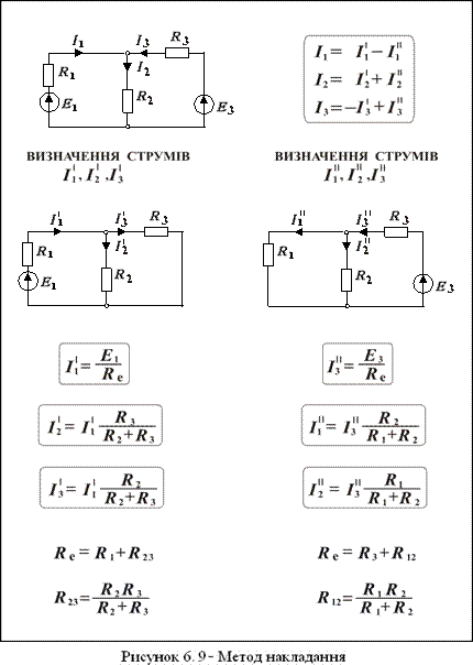 Розрахунок електричних кіл постійного струму методом накладання (рисунок 6.9) застосовують, коли у колі два або більше джерел електричної енергії у різних вітках. Струм у k-й вітці складної електричної схеми дорівнює алгебраїчній сумі часткових струмів у цій вітці від кожної із ЕРС зокрема. Для знаходження часткових струмів із електричного кола почергово вилучають всі джерела електричної енергії, крім одного. Схема із складної перетворюється у просту і її розрахунок спрощується. Так поступають стільки разів, скільки у схемі є джерел електричної енергії. Приклад 1 Дано електричне коло з параметрами елементів: Е1 = 10 В; Е2 = 20 В; R1 = 2, 5 Ом; R2 = R3 = 5 Ом; R4 = 3 Ом; R5 = 2 Ом. Необхідно визначити струми увітках електричної схеми (рисунок 6.10).