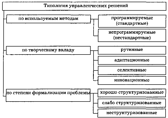 Так, с учетом стереотипности ситуаций и используемых методов выделяются программируемые и непрограммируемые решения. К программируемым обычно относят стандартные и повторяющиеся решения. К непрограммируемым относятся решения, принимаемые в новых ситуациях. Они могут носить разовый, творческий характер, во многом зависят от здравого смысла и интуиции (например, разработка новых технологий, изделий, формирование новой структуры). Отдельные авторы выделяют четыре уровня решений в зависимости от творческого вклада менеджеров в их разработку: рутинные, селективные, адаптационные и инновационные. Первый уровень — рутинные решения. Они принимаются согласно отработанному механизму и имеющейся программе действий. Важно изучить особенности ситуации, соотнести ее с накопленным опытом, принять ответственность за конкретные действия. В проявлении творческого подхода нет необходимости, так как все процедуры решения известны. Второй уровень — селективные решения. Инициатива и свобода действий на данном уровне проявляется в ограниченных пределах. Например, при оценке различных известных альтернатив и выборе из них оптимальных. Третий уровень — адаптационные решения. Они рассчитываются на дополнительные, непредусмотренные трудности. Как правило, при их разработке сочетается использование творческого нестандартного подхода на основе новых идей с отработанными ранее возможностями. Имеет значение личная инициатива руководителя для поиска нового решения известной проблемы. Четвертый уровень — инновационный. Решения этого уровня связаны со сложностью и непредсказуемостью событий. Это вызывает необходимость принятия неординарных решений, содержащих нововведения. Характер проблемы лежит и в основе применения системного анализа как одного из методов обоснования решений. В связи с его использованием выделяются три типа проблем: • хорошо структуризованные; • слабо структуризованные; • неструктуризованные. Под структуризацией понимается возможность количественного выражения зависимостей между элементами ситуации. В процессе структуризации проблем необходимо свести к минимуму количество неформализуемых элементов с таким расчетом, чтобы проблема приобрела более определенный характер. Решаемая проблема, независимо от ее типа, должна увязываться с целями управления предприятием, и на этой основе целесообразно формировать процедуру разрешения ситуации.