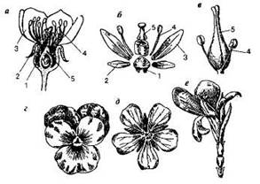 Рис. 8.15. Цветки: а, 6 — с двойным околоцветником; в — без околоцветника; г — неправильный (зигоморфный); д — правильный (актиноморфный); е— асимметричный; 1 — цветоложе; 2 — чашелистики; 3 —лепестки; 4 — тычинки; 5 — пестик.