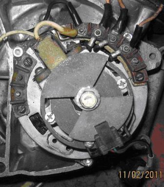 Старая система зажигания (контакты прерывателя, катушки зажигания, конденсаторы, бронепровода) полностью упраздняется. Коммутатор устанавливается в правом бардачке и учьтите комутатор это сердце зажигания и недопускайте попадания влаги на него, катушка зажигания под баком. К сожалению, на катушке нет никаких отверстий или креплений под кронштейн. Собираем модулятор и крепление ДХ, устанавливаем все на штатный генератор, как приведено на рисунке: