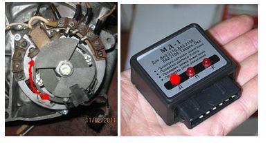 Теперь настройка. Подгоняем поршень одного из цилиндров к ВМТ, отводим на 2.8 мм назад (при использовании бензина АИ-92 желательно уменьшить угол до 2.5 мм). Далее подключаем МД-1 вместо коммутатора и начинаем медленно крутить крепление ДХ вокруг модулятора(по часовой стрелке). Как только " уловите" что загорелся индикатор «Д» на мгновенной диагностике, фиксируйте крепление ДХ именно в этом положении.