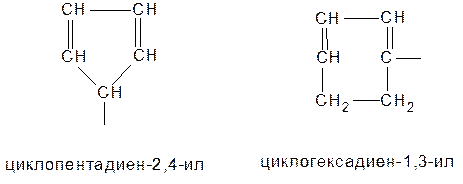 Названия одновалентных радикалов, производимых от циклоалкенов, циклоалкинов и циклоалкадиенов, имеют соответственно окончания енил, инил, диенил. Углеродный атом со свободной валентностью при нумерации получает номер 1, положения кратных связей обозначаются как обычно: