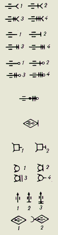 Зенитная пушка. 1 - общее обозначение. 2 - малого калибра, 3 - среднего калибра. Зенитная самоходная установка. 1 - без РЛС, 2 - имеющая РЛС.