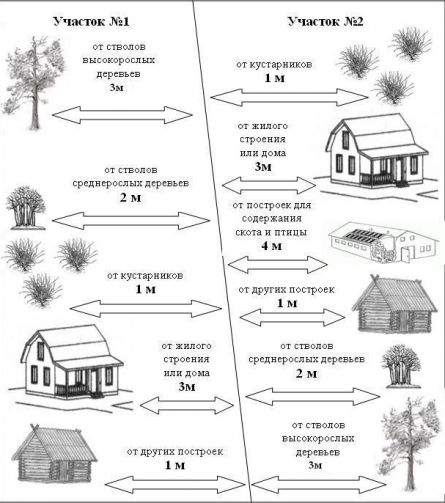 · до дачного дома — 3 м; · до других строений — 1 м; · до вольеров с домашней птицей и животными — 4 м; · до стволов высокорослых деревьев (яблонь, груш и т. п.) — 3 м; · до стволов среднерослых деревьев (вишен, слив и т. п.) — 2 м; · до кустарника — 1 м. Примечание №1: Расстояния жилых помещений до других источников загрязнений устанавливаются соответствующими документами по каждому конкретному фактору (шум, вибрация, электромагнитные колебания, радиация, источники загрязнения воздуха и другие). Примечание №2: Выгребные ямы дворовых уборных должны быть выполнены из конструкций, предотвращающих фильтрацию фекальных стоков в грунт. Указанные расстояния должны соблюдаться как между постройками на одном участке, так и между постройками, расположенными на смежных участках. Что относится к обязательным противопожарным требованиям. Классификация строений по противопожарным признакам зависит от материала, применяемого для возведения несущих и ограждающих конструкций строений. В зависимости от этого строения подразделяются на категории: А. Камень, бетон, железобетон и другие негорючие материалы; Б. То же с деревянными перекрытиями и покрытиями, защищенными негорючими и трудногорючими материалами; В. Древесина, каркасные ограждающие конструкции из негорючих, трудногорючих и горючих материалов. Минимальные противопожарные расстояния между крайними строениями и группами строений на дачных участках должны быть выдержаны в пределах приведенных ниже величин: