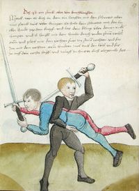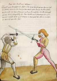 Толкование В Zufechten, когда он целится в нижний сектор ударом или уколом, не защищайся от этого. Скорее, дождись, пока ты сможешь дотянуться до него ударом сверху в голову или нанести укол сверху, и таким образом он будет тобой повержен, ибо все Oberhau все высокие атаки дотягиваются на бОльшую дистанцию, чем нижние удары.