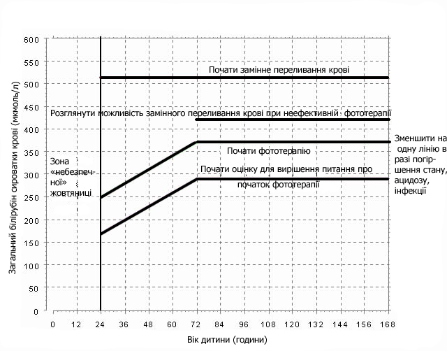 Показання до фототерапії та замінного переливання крові в залежності від рівня загального білірубіну в сироватці крові
