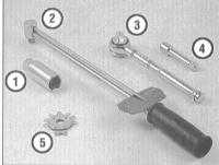 | | 1 — Свечная головка - Оборудована специальным эластичным вкладышем, исключающим возможность случайного повреждения фарфорового изолятора при выворачивании свечи. 2 — Динамометрический ключ - Не входя в число обязательных инструментов, обеспечивает надежную гарантию правильности усилия затягивания свечей зажигания. 3 — Храповой привод - Применяется в комплекте со свечной головкой и динамометрическим ключом.
