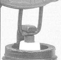 | 5. Межэлектродный зазор свечи проверяется путем введения в него соответствующего щупа измерител и должен соответствовать требованиям, приведенным на ярлыке VECI. Щуп должен с легким сопротивлением проскальзывать между боковым и центральным электродами свечи. Корректировка зазора может быть произведена при помощи специального приспособления, обычно входящего в состав измерителя - подогните соответствующим образом боковой электрод свечи. Если боковой электрод оказывается расположен не точно над центральным, подкорректируйте его положение соответствующим образом. Удостоверьтесь в отсутствии трещин и иных повреждений в фарфоровом изоляторе свечи. Наличие любого рода дефектов изолятора недопустимо. 6. При холодном двигателе отсоедините ВВ провод от свечи зажигания первого цилиндра (см. Раздел Проверка состояния и замена ВВ свечных проводов, крышки и бегунка распределителя). Тяните только за наконечник, а ни в коем случае не за провод! Разумно будет воспользоваться специальным инструментом. 7. При наличии под рукой источника сжатого воздуха, воспользуйтесь им для удаления мусора из свечных ниш двигателя (для этой цели не хуже подойдет и обычный велосипедный насос).