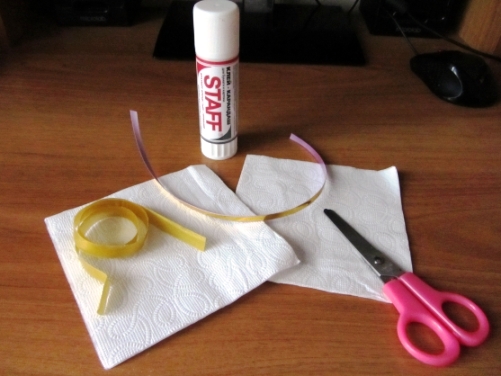 Этого маленького красивого ангелочка очень просто сделать. Им можно украсить как елку, так и новогодний стол. Вам понадобится: - обычные столовые салфетки; - бумага; - клей карандаш; - ножницы; - нитка; - ленточка. 1. Раскройте салфетки и сложите их вместе.