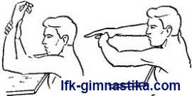 Следующий комплекс упражнений при травме верхних конечностей выполняется из исходного положения стоя, держа в руках гимнастическую палку: 1. Поднимать прямые руки с палкой вверх. 2. Взять палку в одну руку, вытянуть руку с палкой перед собой (палка находится в вертикальном положении). Перекладывать палку из одной руки в другую, при этом свободной рукой выполнять движения в сторону, вверх и перед собой. 3. Поставить палку одним концом на пол, держась больной рукой за другой конец, выполнять движения палкой, как рычагом. 4. Держать палку перед собой двумя руками, вытянутыми вперед, и выполнять круговые движения. 5. Руки опустить вниз, в руках палка. Выполнять движения " маятника" в одну и в другую стороны. 6. Держать палку перед собой на вытянутых руках. Кисти должны быть сведены вместе. Вертеть палку в руках, как " мельницу", при этом перебирая пальцами рук. 7. Больной рукой взять палку и делать ею движения вперед-назад (движения, имитирующие паровоз).