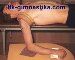Переломы ключицы можно встретить довольно часто, примерно 5% всех переломов - это переломы ключицы. Данный перелом происходит либо в результате прямого насилия, являющегося причиной перелома в любом месте ключицы, либо при падении на бок или согнутую руку, а также в результате падения на выпрямленную руку, в таком случае, как правило, ключица ломается в средней трети ее протяжения. В случае, если травма ключицы требует оперативного вмешательства, лечебные упражнения при переломе ключицы больному назначают после того, как будут сняты все швы. Однако в некоторых случаях (по разрешению врача) лечебная гимнастика назначается на второй день после операции. Методика занятий аналогична методике, применяемой при консервативном лечении. Первый период лечебной гимнастики при переломе ключицы длится до снятия швов, но при этом отведение руки в плечевом суставе до угла 80 градусов разрешается не раньше, чем через две недели, а больше угла 90 градусов - только через три недели. Переломы ключицы могут быть и открытыми (огнестрельные ранения), такого вида переломы нередко сопровождаются повреждением крупных сосудов, а это очень опасно. При таких травмах лечебная физкультура при переломе ключицы применяется с осторожностью и зависит от обширности ранения, состояния раны, а также от общего состояния раненого. Упражнения, применяемые в таком случае, аналогичны тем, которые выполняются при закрытых переломах. В случае вывиха акромиального конца ключицы, при котором происходит разрыв связочного аппарата ключично-акромиального сочленения, необходимо сшить связки, а руку, под прямым углом в плечевом суставе, на 5-6 недель уложить на отводящую шину. В первом периоде занятий ЛФК на второй день после операции больной может выполнять всевозможные движения для пальцев рук, лучезапястного сустава, а также сгибание и разгибание руки в локте на отводящей шине. Как уже было сказано, ЛФК при переломе ключицы, как правило, назначается уже на второй день после травмы. Первый период лечебной физкультуры длится с момента фиксации перелома до снятия шины (около 3 недель). В комплекс включаются дыхательные, общеразвивающие, а также специальные упражнения для пальцев рук.