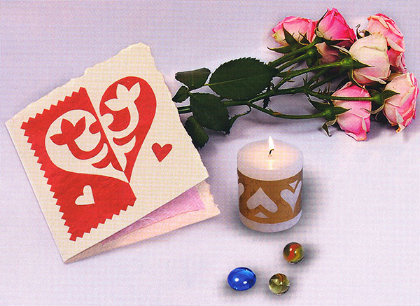 3. Выкроите прямоугольник из красной бумаги, чтобы сделанное из него украшение можно было эффектно разместить на лицевой части открытки. В центральную часть прямоугольника при помощи шаблона и хорошо заточенного мягкого простого карандаша перенесите изображение половинки сердца. Вырежьте сердце по контуру. 4. Верхний, нижний, а также левый края прямоугольной заготовки красного цвета сделайте зубчатыми при помощи портновских ножниц «зигзаг», а в нижней части заготовки ножом со съемными лезвиями вырежьте маленькое сердечко. 5. Из половинки сердца большого размера вырежьте рисунок при помощи острых ножниц или ножа. 6. При помощи твердого простого карандаша и линейки отметьте на лицевой стороне основы из белой бумаги середины верхней и нижней кромок. Едва заметно проведите карандашом вертикальную линию. 7. Приклейте к лицевой стороне основы детали аппликации в такой последовательности: сначала слева от средней линии, вплотную к ней, — заготовку из красной бумаги с зубчатыми краями, затем справа от средней линии, вплотную к ней, — половинку сердца. После этого в левую часть аппликации вклейте половинку рисунка, вырезанного из сердца в обрамлении, а с правой стороны — вырезанное красное сердечко, чтобы оно было симметрично белому сердечку на левой стороне.