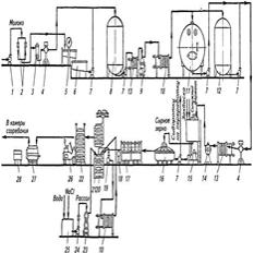 28. Организуйте производство сухого цельного молока. 1- емкость для сырого молока; 2- насос для молока; 3- емкость для взвешивания молока с тензометрическим устройством; 4- емкость для хранения сырого молока; 5-пластинчатый подогреватель; 6- центробежный сепаратор-молокоочиститель; 7-сепаратор-сливкоотделитель; 8- емкость для обезжиренного молока, 9- насос для обезжиренного молока, 10 -пластинчатый охладитель; 11 -счетчик для обезжиренного молока; 12- емкость для хранения молока; 13- трубчатый подогреватель для предварительного подогревания молока; 14- трубчатый подогреватель для окончательного подогревания молока; 15- пленочная вакуум-выпарная установка (трехступенчатая); 16- конденсатор; 17— продуктовый насос; 18- конденсатный насос; 19 — промежуточный бак; 20- гомогенизатор; 21- промежуточный бак с мешалкой; 22- насос для сгущенного молока;.23-сушильная камера; 24- распыливающий диск; 25- калорифер; 26- основной циклон; 27- разгрузочный циклон; 28 -устройство для охлаждения сухого молока.Сухое цельное молоко - сухой молочный продукт, массовая доля сухих веществ молока в котором составляет не менее чем 95%, мдб в сухих обезжир веществах мол - не менее чем 34% и мдж - не менее чем 20%. Сухое цельное молоко вырабатывается в соответствии с требованиями действующего стандарта (ГОСТ 4495-87) по технолог инструкции с соблюдением санитарных норм и правил, утвержденных в установленном порядке. Вкус и запах-первый сорт: Свойственный свежему пастеризованному молоку при распылительной сушке и перерпастеризованному (кипяченому) молоку при пленочной сушке, без посторонних привкусов и запахов; второй сорт: то же, что и для высшего сорта. Допускается слабый кормовой привкус, а для молока распылительной сушки – привкус перепастеризации; Консистенция-мелкий сухой порошок или порошок, состоящий из агломерированных частиц сухого молока. Для 1-го сорта: Допускается незначительное количество комочков, легко рассыпающихся при механическом воздействии, для 2-го сорта: Для пленочного молока – сухой порошок из измельченных пленок. Цвет-белый с кремовым оттенком для распылительного молока; кремовый для пленочного молока, для 2-го сорта допускаются отдельные пригорелые частицы. Точки МБК на схеме: - молоко – т-ра, К, рН - пастеризация – т-ра, эф-ть пастеризации. - гомогенизация – т-ра, давление, эф-ть гомогенизации. - сгущение молока - давление пара, разрежение, т-ра испарения, т-ра нагретого пара, продолжительность сгущения, давление, м.д. сухих в-в, К. - сушка сгущенной смеси – т-ра воздуха, длительность работы сушильной установки. - готовый продукт – м.д. солей тяжелых металлов, м.д. влаги, м.д.ж., К, индекс растворимости, органолептика.Независимо от вида прод-а, предназ-го для сушки, сущ-т ряд условий, обязательных при пр-ве сух прд-в. Сгущ продукт сразу после выхода вакуум-выпарного аппарата слнд-т обязательно профильтровать. Темп-ра сгущ мол перед сушкой д/быть не ниже 40С. В целях интенсификации сушки возможен подогрев до 55-60С. Сушильные установки перед подачей прод нагревают: 1) распыл сушилки- нагревают камеру 15-20 мин, 2) контактные-прогревают пропуская гор воду. Осн-м пок-м по к-му контролируют режим сушки, яв-ся t вход-го и вых-го воздуха. Входного – 160-18С, выходного – 65-95С. Разберем техн пр-ва мол цельного сух, как наиболее расп-го прод. Тепл обработка осущ-ся перед выпариванием в подогревателях и 