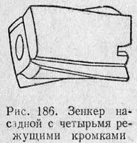 В зависимости от диаметра обрабатываемых отверстий применяют различные конструкции зенкеров. Для малых отверстий (до 35 мм) применяют хвостовые зенкеры с тремя-четырьмя режущими кромками (рис. 185). Для больших отверстий (до 100 мм) зенкеры изготовляют насадными (рис. 186). Их насаживают на оправки из машиноподелочной стали, чем достигается экономия дорогостоящей быстрорежущей стали, из которой сделаны зенкеры. Для работы по чугуну и стали применяют также насадные зенкеры, оснащенные по режущим кромкам пластинками твердого сплава (рис. 187); они допускают более высокие скорости резания и, следовательно, более производительны, чем зенкеры из быстрорежущей стали.