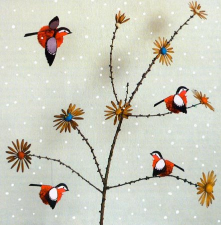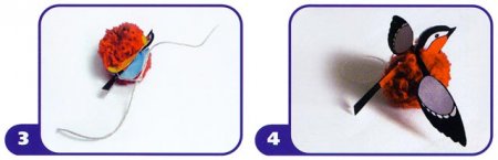 3. Не знімаючи кілець, міцно стягніть ниткою в середині. 4. Вставте голову снігура, вирізану з вклейки, вставте крильця. Зніміть кільця. Пташку можна вішати на ялинку!