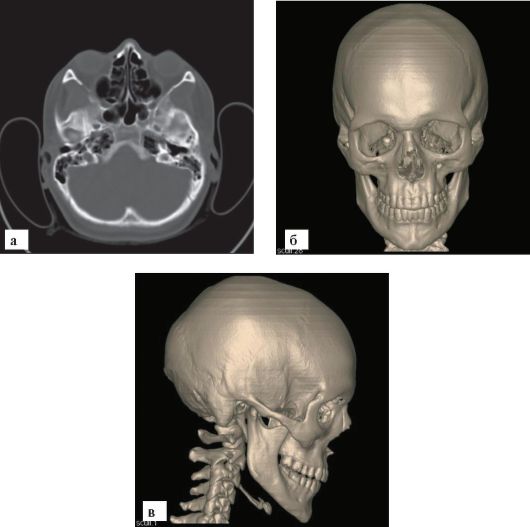 Рис. 3-5. МСКТ черепа: а - поперечный срез; б - трехмерная реконструкция, вид спереди; в - трехмерная реконструкция, вид сбоку ференцируются борозды оболочных артерий, каналы и звездчатые разветвления диплоэтических вен и пахионовых грануляций, а также пальцевые вдавления. Отдельные кости черепа соединяются между собой разного вида швами. В черепе ребенка места с неоконченным окостенением называются родничками. Более широкие возможности для изучения костей черепа представляет КТ. В современных МСКТ фронтальные и сагиттальные срезы реконструируются из набора аксиальных (рис. 3-5). Преимуществом КТ является не только отсутствие суммации теней, но и наличие воз- можности изучения всех тканей данного уровня, включая вещество головного мозга. Верхнюю и нижнюю челюсти, височно-нижнечелюстной сустав исследуют с помощью традиционной рентгенографии и на специальных дентальных рентгенодиагностических аппаратах. В специализиро- ванных клиниках к рентгеновскому методу добавляется КТ и МРТ. Суставы состоят из суставных поверхностей соответствующих костей и хрящевых структур. Последние на рентгенограммах не определяются. Из-за проекционного искажения суставная щель на рентгенограммах шире анатомической. Суставные концы костей четко очерчены и окаймлены плотной замыкающей (субхондральной) пластиной, которая имеет вид плотной тонкой тени. Эта тень является продолжением тени коркового слоя диафиза (рис. 3-6). В специализированных ортопедических клиниках для исследова-