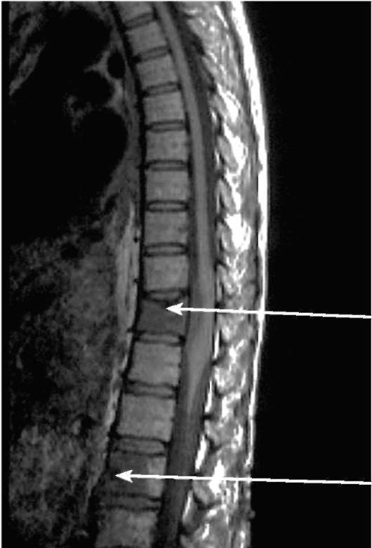 Рис. 3-21. МРТ позвоночника при метастазах рака молочной железы (указаны стрелкой