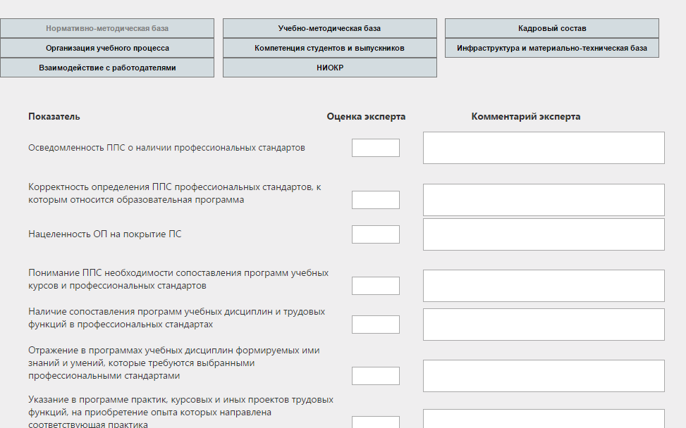 Каждый ВУЗ, чтобы пройти профессионально-общественную аккредитацию, должен зарегистрироваться в системе через данное web -приложение, проанализировать свою образовательную программу, которую необходимо аккредитовать, то есть произвести самооценку внутренним экспертом. Далее приведены группы критериев, по которым необходимо анализировать образовательные программы в области информационных технологий: 1. Нормативно-методическая база: - образовательные программы должны содержать указания на профессиональные стандарты и быть направлены на освоение соответствующих обобщенных трудовых функций; - учебные программы дисциплин должны содержать требования к уровням знаний и умений, описанных в профессиональных стандартах; - учебные программы практик, курсовых и иных проектов должны быть направлены на приобретение опыта выполнения трудовых функций, описанных в профессиональных стандартах, включать соответствующие перечни трудовых действий; - программы мероприятий промежуточной и итоговой аттестации (экзамены, зачеты, выпускные квалификационные работы и др.) должны включать комплексную проверку соответствия навыков студентов выделенным обобщенным трудовым функциям. 2. Учебно-методическая база: - методики преподаваемых дисциплин должны отражать практико-ориентированность некоторых видов учебных занятий (лабораторные работы, деловые игры, проектная деятельность); - учебно-методическая база должна включать средства и ресурсы для ЭО и ДОТ, соответствующие характеру знаний. Например, для приобретения практических навыков должны использовать соответствующие технологии – виртуальные лабораторные среды, системы удаленного доступа к реальному оборудованию и т.д. 3. Кадровый состав: - уровень знаний кадрового состава о профессиональных стандартах в области ИТ, их основных положениях, структуре и требованиях; - наличие индустриальных сертификатов у ППС, подтверждающих соответствующие профессиональные навыки в области ИТ; - участие ППС в профильных конференциях с указанием их типа (научные, научно-практические, педагогические, вендорские); - достижения, награды и т.д. ППС с указанием сроков их получения; - сведения об опыте преподавательской работы в отечественных и зарубежных образовательных организациях; - сведения об опыте работы (стажировка/практика/переподготовка/повышение квалификации) представителей ППС в компаниях по ИТ-профилю (ИТ-компании или ИТ-подразделения организаций). 4. Организация учебного процесса: - сведения о форме реализации образовательной программы (практикоориентированная, академическая, сетевая, общепрофессиональная, специализированная и т.п.); - сведения о применении проектных форм обучения и других практико-ориентированных методов подготовки; - наличие и качество системы руководства студенческими проектами, НИРС; - вовлечение студентов в групповые проекты; - удобство расписания, соблюдение норм по индивидуальной и коллективной работе; - разнообразие видов учебных занятий, особенно проектных форм обучения. 5. Компетенции студентов и выпускников: - оценки текущих и остаточных знаний студентов, в том числе с использованием внешней экспертизы, независимого тестирования; - проведения тестовых квалификационных экзаменов на соответствие требованиям ПС. 6. Инфраструктура и материально-техническая 