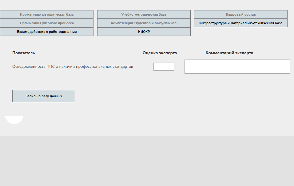 Приложение позволяет собирать и хранить данные по критериям, выставленным техническим заданием: 1. Нормативно-методическая база: - образовательные программы должны содержать указания на профессиональные стандарты и быть направлены на освоение соответствующих обобщенных трудовых функций; - учебные программы дисциплин должны содержать требования к уровням знаний и умений, описанных в профессиональных стандартах; - учебные программы практик, курсовых и иных проектов должны быть направлены на приобретение опыта выполнения трудовых функций, описанных в профессиональных стандартах, включать соответствующие перечни трудовых действий; - программы мероприятий промежуточной и итоговой аттестации (экзамены, зачеты, выпускные квалификационные работы и др.) должны включать комплексную проверку соответствия навыков студентов выделенным обобщенным трудовым функциям. 2. Учебно-методическая база: - методики преподаваемых дисциплин должны отражать практико-ориентированность некоторых видов учебных занятий (лабораторные работы, деловые игры, проектная деятельность); - учебно-методическая база должна включать средства и ресурсы для ЭО и ДОТ, соответствующие характеру знаний. Например, для приобретения практических навыков должны использовать соответствующие технологии – виртуальные лабораторные среды, системы удаленного доступа к реальному оборудованию и т.д. 3. Кадровый состав: - уровень знаний кадрового состава о профессиональных стандартах в области ИТ, их основных положениях, структуре и требованиях; - наличие индустриальных сертификатов у ППС, подтверждающих соответствующие профессиональные навыки в области ИТ; - участие ППС в профильных конференциях с указанием их типа (научные, научно-практические, педагогические, вендорские); - достижения, награды и т.д. ППС с указанием сроков их получения; - сведения об опыте преподавательской работы в отечественных и зарубежных образовательных организациях; - сведения об опыте работы (стажировка/практика/переподготовка/повышение квалификации) представителей ППС в компаниях по ИТ-профилю (ИТ-компании или ИТ-подразделения организаций). 4. Организация учебного процесса: - сведения о форме реализации образовательной программы (практикоориентированная, академическая, сетевая, общепрофессиональная, специализированная и т.п.); - сведения о применении проектных форм обучения и других практико-ориентированных методов подготовки; - наличие и качество системы руководства студенческими проектами, НИРС; - вовлечение студентов в групповые проекты; - удобство расписания, соблюдение норм по индивидуальной и коллективной работе; - разнообразие видов учебных занятий, особенно проектных форм обучения. 5. Компетенции студентов и выпускников: - оценки текущих и остаточных знаний студентов, в том числе с использованием внешней экспертизы, независимого тестирования; - проведения тестовых квалификационных экзаменов на соответствие требованиям ПС. 6. Инфраструктура и материально-техническая база: - сведения об использовании аппаратного и программного обеспечения: тип, наименование, версии, объем использования (напр., в часах аудиторных и внеклассных занятий). Указывается только обеспечение, используемое как предмет изучения либо как учебные материалы в электронной форме. Не указывается обеспечен