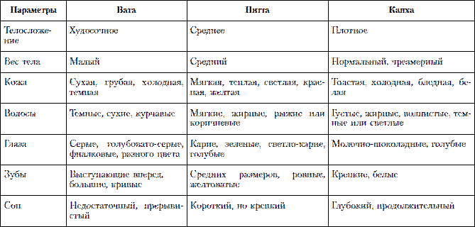 Первым шагом к достижению внутреннего баланса является определение ведущей доши, то есть того типа энергии, которая у вас преобладает. Как правило, именно эта энергия оказывается разбалансированной. Три доши – вата, питта, капха – отвечают за все физиологические и психологические функции организма человека. Доминирующей дошей (одной или двумя) будет обусловлен тип конституции, который определяется уже при зачатии. Например, человек может быть по преимуществу вата с более слабыми проявлениями капхи и малым количеством питты (его тип конституции – вата). Другой может иметь одинаковые количества питты и капхи и малое количество ваты (определим его конституцию как питта-капха). Итак, различают семь основных типов конституции: 1) вата; 2) питта; 3) капха; 4) вата-питта; 5) питта-капха; 6) вата-капха; 7) вата-питта-капха (встречается редко). Разобравшись, к какому типу конституции вы относитесь, можно сделать определенные шаги к восстановлению или улучшению своего здоровья. Конечно, лучшим способом узнать о своей пракрити и викрити будет обращение к врачу, практикующему аюрведу. Если же это невозможно, то вы можете попытаться получить представление о своей конституции c помощью теста. Соблюдая соответствующую диету, овладев определенными способами приготовления пищи, ведя такой образ жизни, какой подходит конкретно вам, вы можете достичь прекрасного здоровья, каким бы ни был тип вашей конституции. Прежде чем вы обратитесь к тесту, полезно будет ознакомиться со свойствами, присущими каждой доше (см. табл. 1).