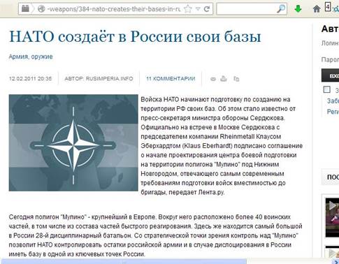 Цитата: " Войска НАТО начинают подготовку по созданию на территории РФ своих баз. Об этом стало известно от пресс-секретаря министра обороны Сердюкова. Официально на встрече в Москве Сердюкова с председателем компании Rheinmetall Клаусом Эберхардтом (Klaus Eberhardt) (Германия) подписано соглашение о начале проектирования центра боевой подготовки на территории полигона " Мулино" под Нижним Новгородом, отвечающего самым современным требованиям подготовки войск вместимостью до бригады, передает Лента.ру".(12.02.2011)