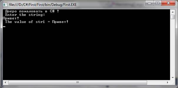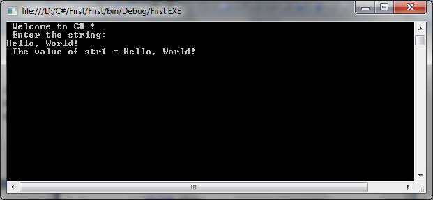 Попробуйте заменить в программе оператор вывода Console.WriteLine(" Welcome to C++! "); следующим оператором: Console.WriteLine(" Добро пожаловать в C#! "); Откомпилируйте (точнее говоря, скомпонуйте) программу и запустите ее на выполнение. Как видно, Visual Studio 2010 работает и с кириллицей: