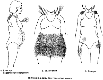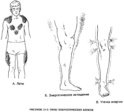 На рис. 12-1 и 12-2 показаны блоки, как они видятся мне. Блок «преувеличения» (рис.12—1А) является результатом подавления чувств и энергии до того состояния, когда они застаиваются и вызывают скопление флюидов тела в соответствующей области. В той области тела развивается опухоль. Этот блок обычно имеет энергию низкой интенсивности, которая, как правило, ассоциируется с отчаянием. Если блок остается, «Кольчуга» (рис. 12-1 В) — это результативный блок, помогающий человеку избежать некоторых ощущений, в особенности страха, благодаря быстрому перемещению по энергетическому телу в то время, когда человек подвергается испытаниям жизненной ситуацией или терапией. Например, если целитель пытается высвободить блок пациента через упражнение или глубокий массаж, блок просто переместится в другую часть тела. Возможно, этот тип блокирования не вызовет болезнь так скоро, как блоки других типов. Будет казаться, что в жизни пациента все превосходно. Он будет преуспевать в миру, вступит в «безупречный» брак, будет иметь образцовых детей, но все же у него останется неопределенное ощущение чего-то упущенного. Он сможет переживать глубокие чувства лишь короткий промежуток времени, затем вытаскивая себя из них. В конечном итоге, он скорее всего создаст в своей жизни какой-либо кризис, чтобы прорваться к глубоким чувствам. Этот кризис может принять любую форму, например обернуться внезапной непредвиденной болезнью, несчастным случаем или конфликтом. «Латы», изображенные на рис.12-2А, сдерживают все типы чувств, замораживая их. Они перемещаются в разных участках тела в виде поля высокого напряжения. Это поле эффективно помогает человеку построить хорошо структуированную жизнь на внешнем плане. Тело будет хорошо сложено; мускулы крепки. Но на личностном уровне жизнь не будет столь же благополучной, потому что «латы» успешно нейтрализуют все чувства. Это создает высокое напряжение по всему телу, что может привести к нескольким различным типам заболеваний: к язве, вызванной перенапряжением, или к проблемам с сердцем из-за физического «надрыва» в жизни. Чувствуя в своем теле неполадки, например, напряжение в длинных мускулах, человек, возможно, будет перенапрягать их, что приведет к лубку голени или сухожилий. Этот человек будет вести внешне «совершенную» жизнь при отсутствии глубоких личных связей. Возможно, он тоже будет время от времени создавать в своей жизни какие-либо кризисы вроде тех, что упоминались выше, и это поможет ему соединиться со своей более глубокой реальностью. У многих мужчин это происходит через сердечный приступ. Например, я знаю одного весьма преуспевающего бизнесмена, который владел несколькими магазинами с очень большим оборотом. Он был так занят делами, что отдалился от семьи. После того, как у него случился сердечный приступ, его дети пришли к нему и сказали: «Ты должен остановиться, иначе ты умрешь. Учи нас, чтобы мы помогали тебе в делах». Он обучил их, и семья воссоединилась. Блок энергетического истощения (рис. 12-2Б) — это просто замедление течения энергии вниз по конечностям в направлении периферического конца. Человек «отрезает» конечности, не позволяя энергии течь по ним. Это приводит к ослаблению конечностей и в некоторых случаях даже к недоразвитости в соответствующей области тела. Такой человек будет уклоняться от ис