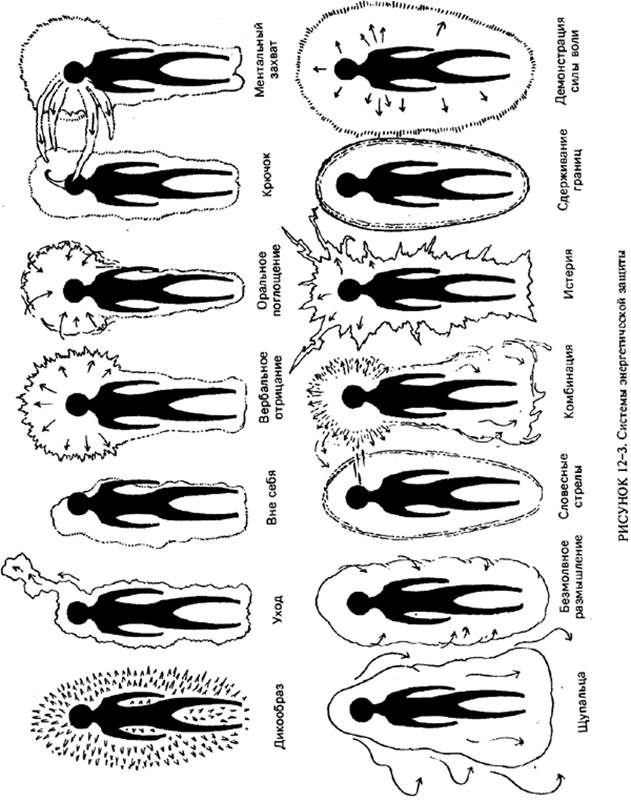 Энергетические защитные системы Все мы создаем блоки из-за того, что видим мир как небезопасный. Мы строим защитные модели, которые затрагивают всю нашу энергетическую систему. Наши энергетические защитные системы предназначены для того, чтобы противостоять входящим силам, обороняясь от них агрессивно или пассивно. Блоки служат для того, чтобы выказать силу и тем самым отпугнуть агрессора или косвенным образом отвлечь наше внимание, не дозволяя нам того, чего мы хотим. Примеры энергетических защитных систем, которые я наблюдала, показаны на рис. 12-3. Эти энергетические системы используются, когда индивид ощущает себя в опасности. Аура «дикобраза», обычно бело-серая по цвету, для прикосновения колючая и неприятная, острая. Часто, когда я прикасалась к кому-то, кто не желал этого, я ощущала покалывания на своей руке. Большинство людей реагируют на такую защиту отдалением. При защите через «уход» часть сознания и ауры личности, попадающая под угрозу, просто покидает тело в облаке светло-синей энергии. Взгляд человека будет казаться стеклянным, хотя и предполагается, что он очень внимательно слушает вас. То же самое относится к человеку, который «вне себя». Эта конфигурация более продолжительна, чем «уход», длящийся только от нескольких секунд до нескольких часов. Манифестация «вне себя» обычно длится значительно дольше — целые дни или даже годы. Я видела людей, годами пребывающих частично вне тела из-за какой-либо травмы или раннего хирургического вмешательства. В одном случае молодая женщина перенесла операцию на сердце в двухлетнем возрасте. Ей был 21 год, когда я работала с ней, помогая более прочно утвердить в теле ее энергетические поля. Ее высшие тела были частично рассоединены и уплывали от нее. Эта несвязность привела к несвязности в ее чувствах. Вербальное отрицание ассоциируется с большим скоплением энергии, обычно желтой, в области головы, с серьезным блоком в области шеи и с истощением энергии в нижней части ауры, которая бледна и покойна. Чтобы поддержать свой status quo, человек проявляет активность в речи, поддерживая некоторое ощущение оживленности. Такой вербальный обмен удерживает течение энергии в голове. Оральное поглощение близко соотносится с вербальным отрицанием в том, что при нем эффективно всасывается энергия от окружающих для наполнения своего поля, что человек обычно не может сделать за счет естественной окружающей среды. Другими словами, у человека есть некоторый ущерб в способности подпитываться оргоном из окружающей атмосферы, из-за чего он нуждается в энергии, уже усвоенной другими. Такое засасывание можно ощутить в болтовне, которая скучна и утомительна для собеседника, или увидеть ее в абсолютно пустых глазах некоторых людей. Такие люди любят находиться среди других для некоторого обобществления. Существует другой тип людей, которым необходимо разрядить излишки энергии /мазохистский тип/ и которые становятся хорошими партнерами для оральных поглотителей. Вместе они очень хорошо удовлетворяют потребности друг друга /см. гл.13/. «Крючки», которые я видела на головах некоторых людей, обычно принадлежат тем, кто имеет психопатическую структуру характера и испытывает противостояние, скажем, со стороны какой-то группы людей. В этой ситуации они становятся очень опасливыми и формируют на макушке 