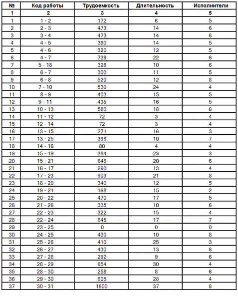 Система СПУ позволяет: - составлять календарный план реализации комплекса работ; - выявлять и мобилизовать резервы времени, трудовые, материальные и денежные ресурсы; - повышать эффективность управления, прогнозируя и предупреждая возможные срывы в ходе выполнения работ. Система СПУ включает следующие основные этапы: - выявление работ, которые необходимо провести, составление их подробного перечня и установление их последовательности и связи между ними; - построение сетевого графика на основе выявленной очередности выполнения работ; - учет имеющихся ресурсов, установление количественных оценок по каждой работе (например, время выполнения, количество исполнителей); - расчет параметров сетевого графика; - анализ и оптимизация сетевого графика (для ускорения выполнения работ производятся необходимые переброски ресурсов); - использование сетевого графика как основного инструмента управления ходом работ. Построим сетевую модель на разработку нового образца изделия и произведём расчёт параметров сети. Расчет будем производить с помощью программы «Сетевое планирование», которая служит для работы с сетевыми графиками. После ввода таблицы работ программа водит следующие графические изображения и параметры сетевого графика: - таблица резервов времени работ до и после оптимизации сетевого графика; - таблица параметров сетевого графика до и после его оптимизации; - графическое изображение сетевого графика до и после его оптимизации; - графическое изображение графика Ганта до и после оптимизации сетевого графика; - графическое изображение эпюры загрузки до и после оптимизации сетевого графика; - оптимизация сетевого графика. Произведем расчет: а) создадим таблицу работ (рисунок 4.2):