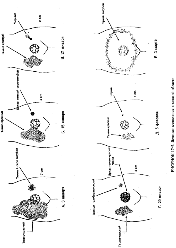Примеры внутреннего видения Пример такого видения показан на рис. 17-1. Слева вверху вы видите поверхностный обзор ауры спереди, вверху справа — внутренний взгляд, и внизу — поверхностный обзор сзади. Здесь показан пример, когда моя подруга упала на льду и повредила плечо. Работая с нею, я увидела «аурическое кровоизлияние» из передней части плеча, из-за которого она теряла энергию. Задние линии энергии на трапециевидной мышце были запутаны и нуждались в распрямлении. Я накрыла правой рукой место «кровоизлияния», чтобы остановить его и устранить узлы на спине. При этом я могла видеть раздробление плечевой кости, которое впоследствии подтвердилось рентгеном. Это короткое /получасовое/ лечение исцелило кровотечение и сплетения, что помогло скорейшему излечению раздробленной кости. В другом примере на рис. 17-2 показана яичниковая киста, которая по моим наблюдениям была размером с теннисный мяч, около 7 см в диаметре. 3 января (рис.17-2А) она выглядела затемненной, голубовато-серой. Врач уже диагностировал кисту, но не тазовое воспалительное заболевание/ТВЗ/. 15 января (рис.17-2Б) киста была сжата до 4 см, и врач диагностировал ТВЗ. 21 января (рис.17-2В) она уменьшилась до 2 см, но стала темнее и появилось связанное с ней странное спиральное образование. Пациентка находилась на очистительной диете. /В то время я не руководила ее лечением, а лишь наблюдала прогресс./ 29 января киста увеличилась до 3 см. 6 февраля (рис.17-2Д) киста сократилась до 1 см; 3 марта (рис.17-2Е) она полностью исчезла, уступив место хорошей здоровой предменструальной энергии. Все эти наблюдения за изменениями размера соотносились с наблюдениями врача, исследовавшего тазовую область.