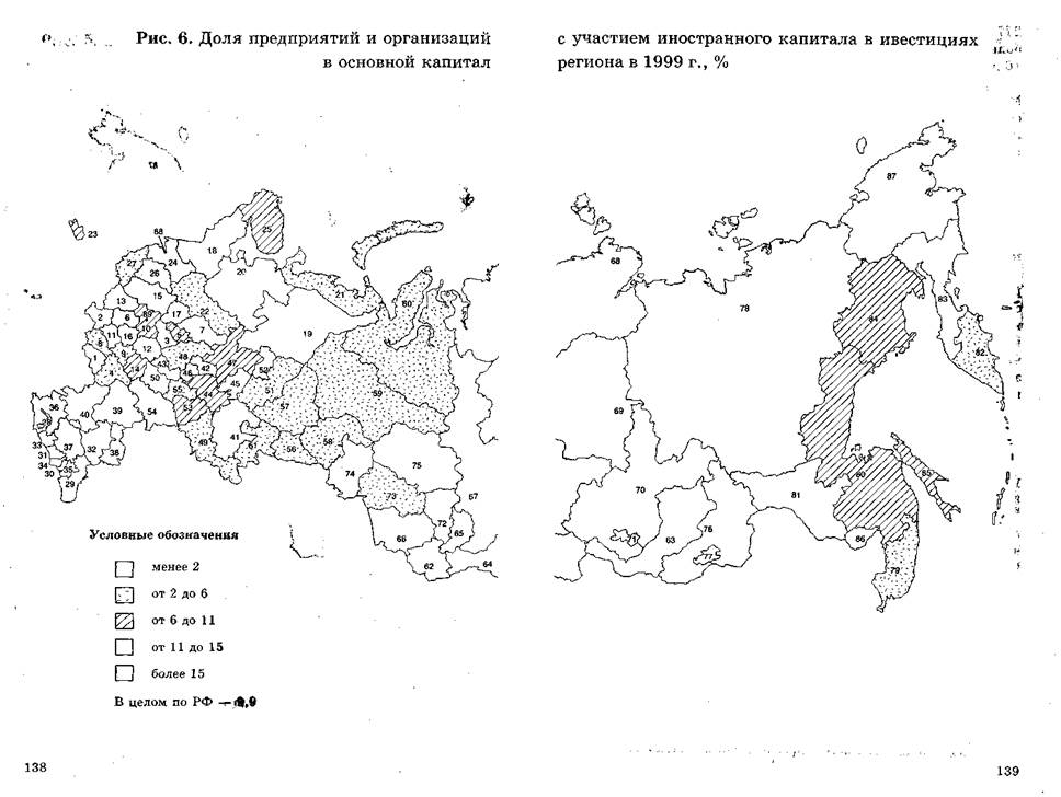 К шестой группе относятся приграничные регионы, не располагающие значительным экспортным потенциалом. Это либо районы низкой степени хозяйственного освоения, либо сильно отстающие по социально-экономическому развитию. К ним относятся субъекты РФ, расположенные по дальневосточной, восточносибирской и северокавказской периферии: республики Алтай, Бурятия, Тува, Астраханская, Амурская, Магаданская и Читинская области, Еврейская АО, республики Северного Кавказа. В этих регионах импорт, как правило, превышает экспорт. По абсолютным и относительным показателям развития внешней торговли они уступают регионам других групп. Вопросы для обсуждения 1. Принципы классификации субъектов РФ по типу внешнеторговых связей. 2. Охарактеризовать 5 групп субъектов РФ по типу их внешнеторговых связей. 4.2. Особенности размещения иностранных инвестиций и кредитов по субъектам РФ Еще более неравномерно по регионам страны размещаются иностранные инвестиции. Они осуществляются в большинстве субъектов Федерации, однако основной их объем реализуется в 10-15 регионах. В 1999 г. на долю первой десятки пришлось 78, 5% всех иностранных инвестиций и в том числе 83, 9% прямых. Во внешней торговле первые десять регионов дают около 60% внешнеторгового оборота. Состав регионов, крупнейших получателей инвестиций в 1995 - 1999 гг., довольно сильно изменился. В сравнении с ним региональная структура внешней торговли значительно стабильнее. Изменения в десятке крупнейших регионов по размещению иностранных инвестиций показаны в таблице 20. За 1993 — 1999 гг. только у 21 субъектов РФ накопленный объем прямых иностранных инвестиций (ПИИ) превысил уровень 100 млн. долл.: Москва — 6921 млн. долл. или 37, 7% от их общего количества, размещенных в стране, Московская обл. — 1978 млн. долл. (10, 8%), Сахалинская обл. — 1367 (7, 5%), Санкт-Петербург — 1339 (7, 3%), Краснодарский край — 794 (4, 3%), Тюменская обл. — 745 (4, 1%), Ленинградская обл. 461 (2, 5%), Самарская обл. — 436 (2, 4%), Новосибирская обл. — 370 (2, 0%), Республика Коми и Свердловская обл. по 267 млн. долл. (1, 5%), Челябинская обл. — 218 млн. долл., Хабаровский край 176 (1, 2%), Приморский край — 215 (1, 2%), Магаданская обл. — 207 (1, 1%), Волгоградская обл. — 170 (0, 9%), Калужская обл. — 166 (0, 9%), Республика Татарстан — 145 (0, 8%), Иркутская обл. — 135 (0, 7%), Нижегородская обл. — 118 (0, 6%), Орловская обл. — 101 (0, 5%). На них пришлось более 90% всех размещенных за этот период прямых иностранных инвестиций. По объему накопленных инвестиций на одного жителя регионы резко различаются друг от друга. Наибольшие величины этого показателя отмечаются у Сахалинской области — 2282 долл. на одного жителя. Далее следуют малонаселенная Магаданская область — 866 долл., Москва — 811 долл., Московская обл. — 306 долл., Санкт-Петербург — 287 долл., и Ленинградская область — Таблица 20 Десять крупнейших регионов по размещению иностранных инвестиций в 1995 и 1999 гг. в % от их общего объема в РФ