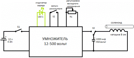 Для тех, кто не способен сделать преобразователь, есть версия Гаусс пушки от сети ~220 вольт. Вот схема умножителя от сети:
