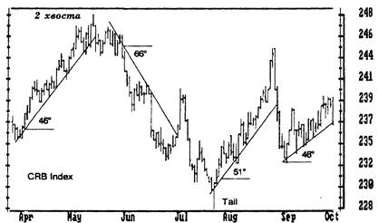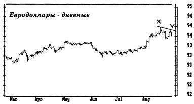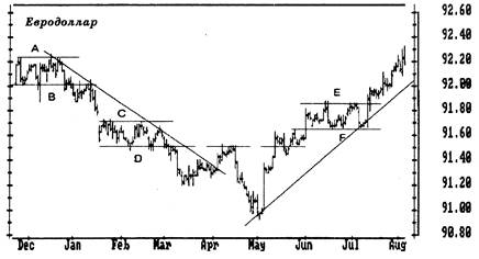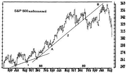 Рис. 6. Линии тренда и “хвосты” Проводите линии тренда через области консолидации цен и оставляйте в стороне экстремальные цены. " Хвосты" - это высокие черточки в конце тренда, они выскакивают из областей консолидации. Рынок уходит от " хвостов", предлагая хорошие возможности для игры в противоположном направлении. Обратите на то, как упорно месяц за месяцем повторяются углы наклона линий тренда. Если вы их знаете, то вам будет проще нарисовать предварительные линии тренда. На правом краю графика цены касаются линии тренда. Покупайте, как только увидите, что очередная черта не дала нового максимума. Как отмечал Стейдлмайер, черта, выглядящая как палец, выставленный из плотного графика, показывает ценную точку отсчета цены для краткосрочной игры. Рынки постоянно колеблются в поисках области, в которой объем торгов будет наибольшим. Хвосты показывают, что данная цена была отвергнута рынком. Обычно это приводит к броску в противоположном направлении. Как только вы обнаружите хвост, играйте против него. Поместите вашу предохранительную остановку на середине хвоста. Если рынок начнет “жевать свой хвост”, пора выходить из игры. Виктор Сперандео приводит другой метод изображения линий трендов в своей книге “Игрок Вик”. Его техника помогает определить разворот хорошо установившегося тренда (рис. 7). Сперандео проводит линию восходящего тренда через наименьший минимум за весь тренд и через наивысший локальный минимум, предшествующий самому высокому максимуму. Такая линия может и не касаться цен между этими двумя точками. Пересечение этой линии ценами дает первый сигнал, что тренд меняется. Следующий сигнал подается тогда, когда цены доходят до предыдущего максимума и двигаются от него вниз. Третий сигнал поступает, когда цены опускаются ниже предыдущего минимума. Он подтверждает, что восходящий тренд изменил направление. Зеркальное отражение описанной процедуры применимо к нисходящему тренду. Классификация линий тренда Основной и наиболее важной характеристикой линии тренда являемся угол ее наклона. Когда линия тренда наклонена вверх, " быки" контролируют ситуацию и нужно искать возможность для покупки. Когда линия наклонена вниз, у руля " медведи" и нужно искать пути продажи. Вы можете классифицировать линии тренда по степени важности при помощи пяти показателей: временному масштабу, длительности, числу раз, когда цены касались линии тренда, углу наклона и объему сделок. Чем больше временной масштаб, тем важнее линия тренда. Линия тренда на недельном графике показывает более существенный тренд, чемна дневном. Ливия тренда на дневном графике более важна, чем на часовом, и так далее. Чем длиннее линия тренда, тем она надежнее. Короткая линия тренда отражает поведение масс на коротком интервале времени. Более длинная линия отражает их поведение за более длительный срок. Чем дольше длится тренд, тем больше ее инерция. Серьезный рынок " быков" может следовать своим трендом в течение нескольких лет. Чем больше число соприкосновений цен с линией тренда, тем она надежнее. При восходящем тренде, возврат к линии означает восстание среди " медведей". При нисходящем тренде подскок цен до линии означает восстание " быков". Когда цены доходят до линии тренда к затем движутся обратно, вы знаете, что доминирующая на рынке группа победила во