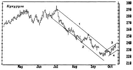 Восходящая линия, соединяя минимумы 1 и 2, указывает на восходящий тренд. Обратите внимание на то, что цены иногда прорываются через линию тенденции вниз, но затем вновь поднимаются к ней (3). Это дает прекрасную возможность продавать. То же самое происходит опять в точке 7, где цены вновь возвращаются к линии тренда после того, как они опустились ниже ее. Когда вы играете в направлении линии тренда, вы обычно играете в направлении рыночного прилива. На правом краю графика вы должны искать возможность для продажи, поскольку тренд идет вниз. Не продавайте немедленно, цены слишком далеко под линией тренда и даже при вступлении в игру страховочные меры не смогут уменьшить Ваших потерь. Важно дождаться сделки с хорошим отношением прибыли к риску. Терпение -добродетель игрока. Если вы подождете до минимума, то ваш риск будет меньше, но вы приобретете конкурентов четырех разновидностей: держателей позиции, которые хотят добавить к позиции, тех игроков, которые хотят закрыть позицию, которые пока еще не купили, и игроков, продавших слишком рано и теперь стремящихся купить, зал ожидания спада цен весьма полон! Рынок не слишком славится благотворительностью и глубокий спад вполне может означать начало смены направления тренда. Эти рассуждения справедливы и при нисходящем тренде. Ожидание отката назад, когда тренд набирает ход - это занятие для любителей. Если рынок находится в коридоре цен, а вы - в ожидании прорыва, то вам придется решать, покупать или в предвкушении прорыва, или во время прорыва, или во время отката после действительного прорыва. Если вы работаете с несколькими позициями, то можете треть покупать в ожидании прорыва, треть во время прорыва и треть во время отката. Какое решение вы ни примете, одно правило по управлению капиталом всегда оградит вас от самых рискованных сделок. Расстояние от точки входа до Вашей меры предосторожности должно быть не больше, чем 2 процента Вашего капитала (см. главу 10). Независимо от того, насколько выгодной представляется сделка, пропустите ее, если она требует более удаленных мер предосторожности. Во время тренда тактика управления капиталом должна быть другой, чем во время коридора цен. В тренде разумно сделать объем позиции меньше, а меры предосторожности поместить дальше. Тогда у вас будет меньше шансов пострадать от колебаний рынка, а риск по-прежнему останется под контролем. Во время коридора цен очень важно правильно определить момент выхода на рынок. Здесь важна точность, поскольку возможностей для извлечения прибыли мало. Тренд прощает запаздывание с вступлением в игру, если вы продолжаете действовать в направлении тренда. Старые игроки советуют: “Не ломайте себе голову на рынке " быков" ”. Если вы не уверены, находится рынок в коридоре цен или в тренде, то вспомните, что профессионалы предполагают существование коридора цен, пока не доказано обратное. Если вы все еще в сомнении, отойдите в сторону. Профессионалы любят коридор цен, поскольку они могут приобретать и сбрасывать позиции почти без риска быть захваченными трендом. Поскольку они выплачивают низкие или вообще нулевые комиссионные и не страдают от разницы цен, игра на слегка колеблющемся рынке для них прибыльна. Тем из нас, кто играет вне операционного зала, лучше дождаться возникновения тренда. Во время тренда вы можете з